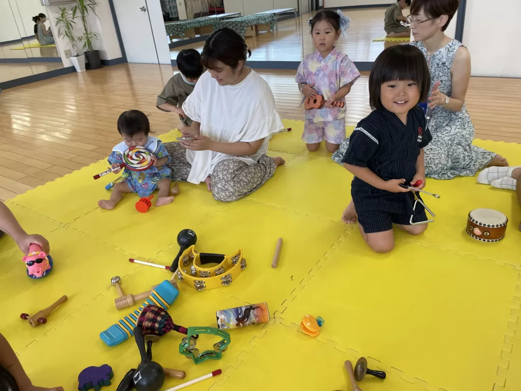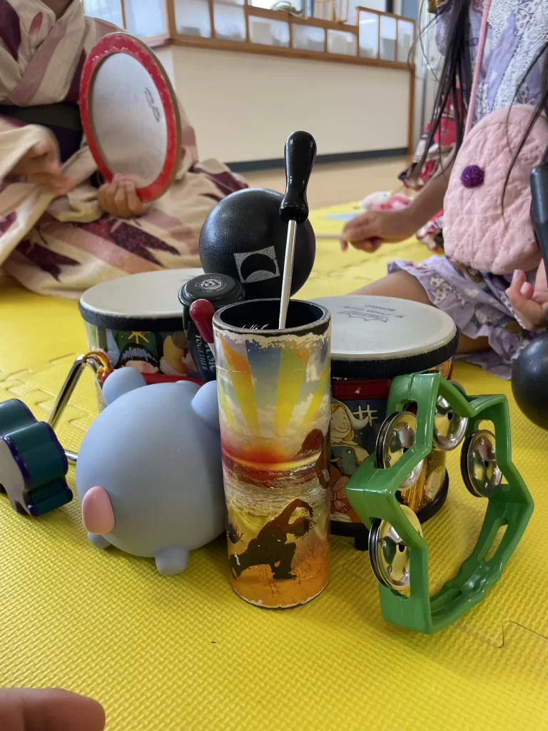 テンションもあがり自分の好きな楽器、お気に入りの楽器をさがして叩いたり、ふったり、かぶったり、なめたり。